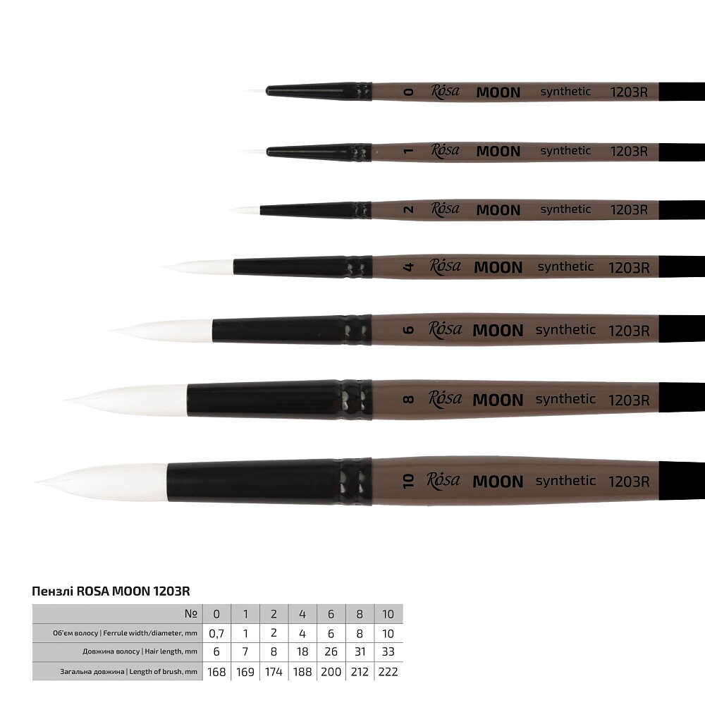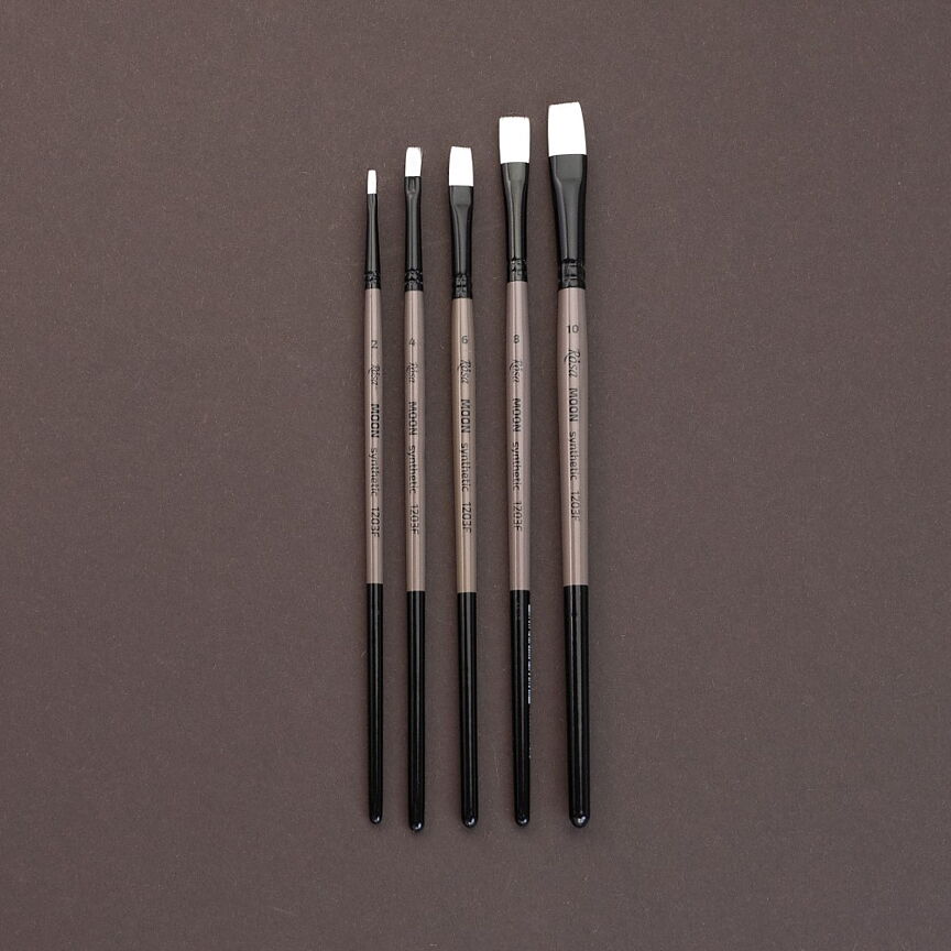 MOON-serien - penslar gjorda av elastiskt mjukt syntetiskt vitt hår på ett kort skaft. Mjukt, men ändå elastiskt och kontrollerat hårstrån håller sin ursprungliga form väl när det är torrt och behåller det när det är blött. Runda och vinklade former har en skarp spets, vilket är bekvämt för att skapa tunna linjer och måla små detaljer, och gör det också möjligt att arbeta med små bitar. Lämplig för arbete med akrylfärg.